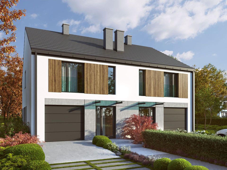 Nowoczesna bryła z dużymi przeszkleniami i dachem bez okapów nadaje budynkom elegancki, współczesny charakter, który wyróżnia się na tle okolicy. To nie jest kolejna „szeregówka" — to dom, na który sąsiedzi będą patrzeć z podziwem.